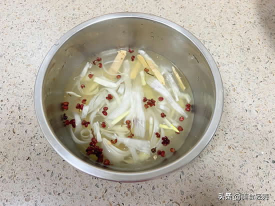 第二点:打入葱姜花椒水。把葱姜切丝,放入碗中,再放入适量的花椒粒,倒入200克清水,用手把葱姜花椒粒搓揉一下,便于出味,然后过滤掉料头,把汁水分3次顺时针打入牛肉馅中。
