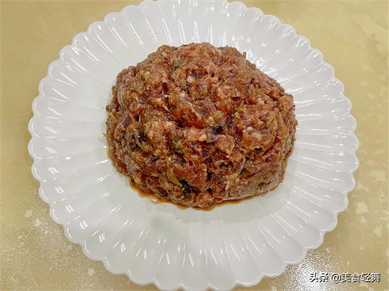切记要分多次把汁水“打入”馅中,只有把水吃进牛肉中,肉馅才不会出水,口感也不会发柴,肉馅才好更嫩。