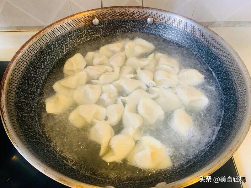 下完饺子后,用勺子顺着锅底搅动一下,防止粘锅,大火煮开后,点上3次清水,饺子鼓囊囊漂浮在水面上,这时饺子就成熟了,大约就是3-5分钟左右,捞出即可食用。