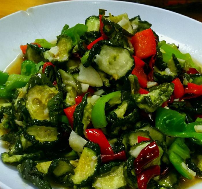 ③锅里倒入适量油,下蒜末、姜丝、干辣椒爆香,然后下黄瓜干、青红辣椒,炒至断生后加食盐、白糖、鸡精,翻炒均匀即可出锅。