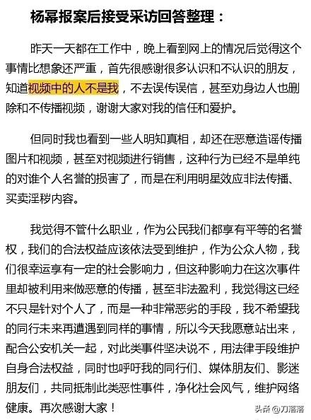 杨幂现身朝阳门派出所就不雅视频报案维权。接受采访的杨幂第一句话就是视频中那个人不是她,请大家还她一个清白,每个人都有自己的名誉权。这件事情发生后,全家人都特别支持她,自己亲自过来报案也是全家一起商量的结果。希望自己这次站出来后,娱乐圈不要再有这种随意黑明星的事件发生。