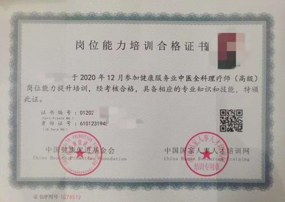 证书应该由国家卫健委直属单位中国健康促进基金会与国家人社部下属事业单位中国国家人事人才培训网共同颁发的,具有双章双证。这种证书的权威性非常强,具有很高的含金量,是正规的证书。这类证书被国家承认认可,在全国可以查询,不限地区、不限民族,还可以出国劳务。