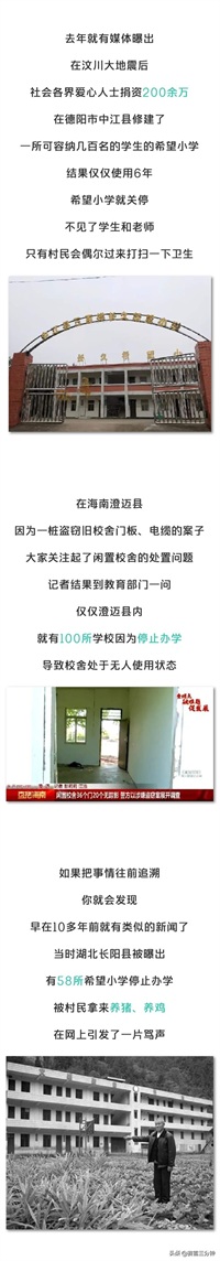 许多废弃的乡村学校,都兴建于90年代和00年代初,因为当时国家大力推行普九计划,也就是普及九年制义务教育,必须保证每个孩子都有书读,而当时农村地区交通不便,于是建设方针就成了“就地办学、村村都有校”。