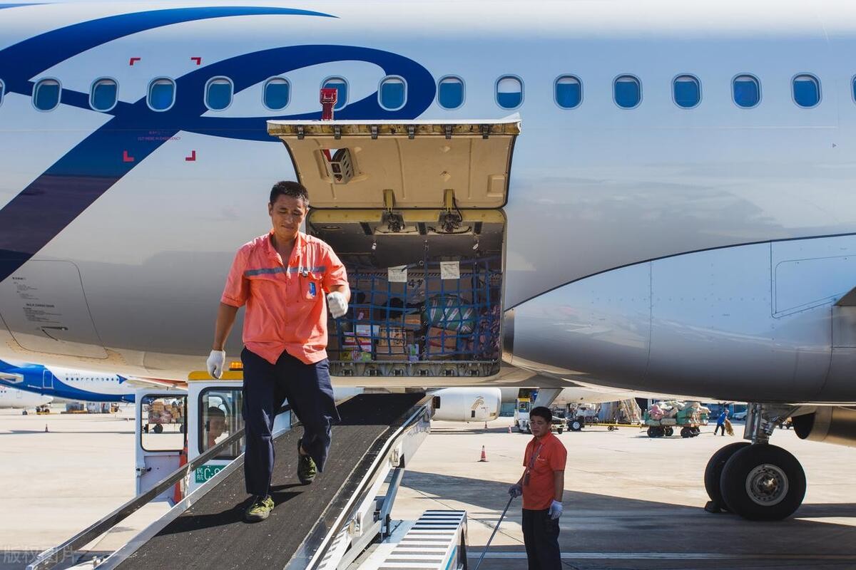 国际机场,行李工人在装卸飞机行李