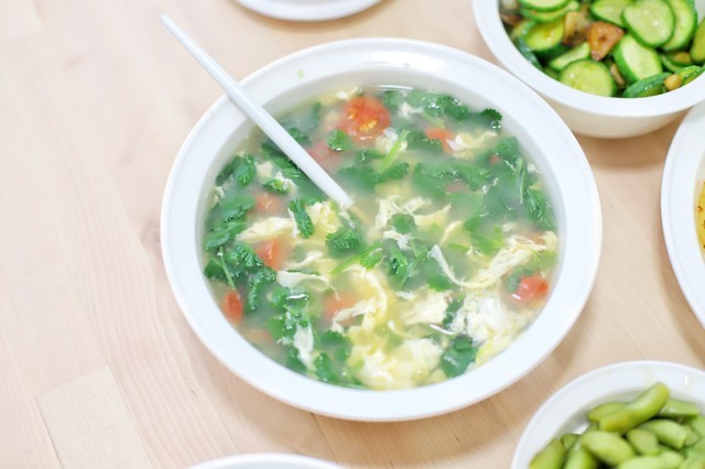 番茄蛋汤:将番茄切成小块,热锅凉油下番茄煸炒至出汁,加入适量开水烧开,打入鸡蛋液搅拌均匀,加入盐和胡椒粉调味即可。