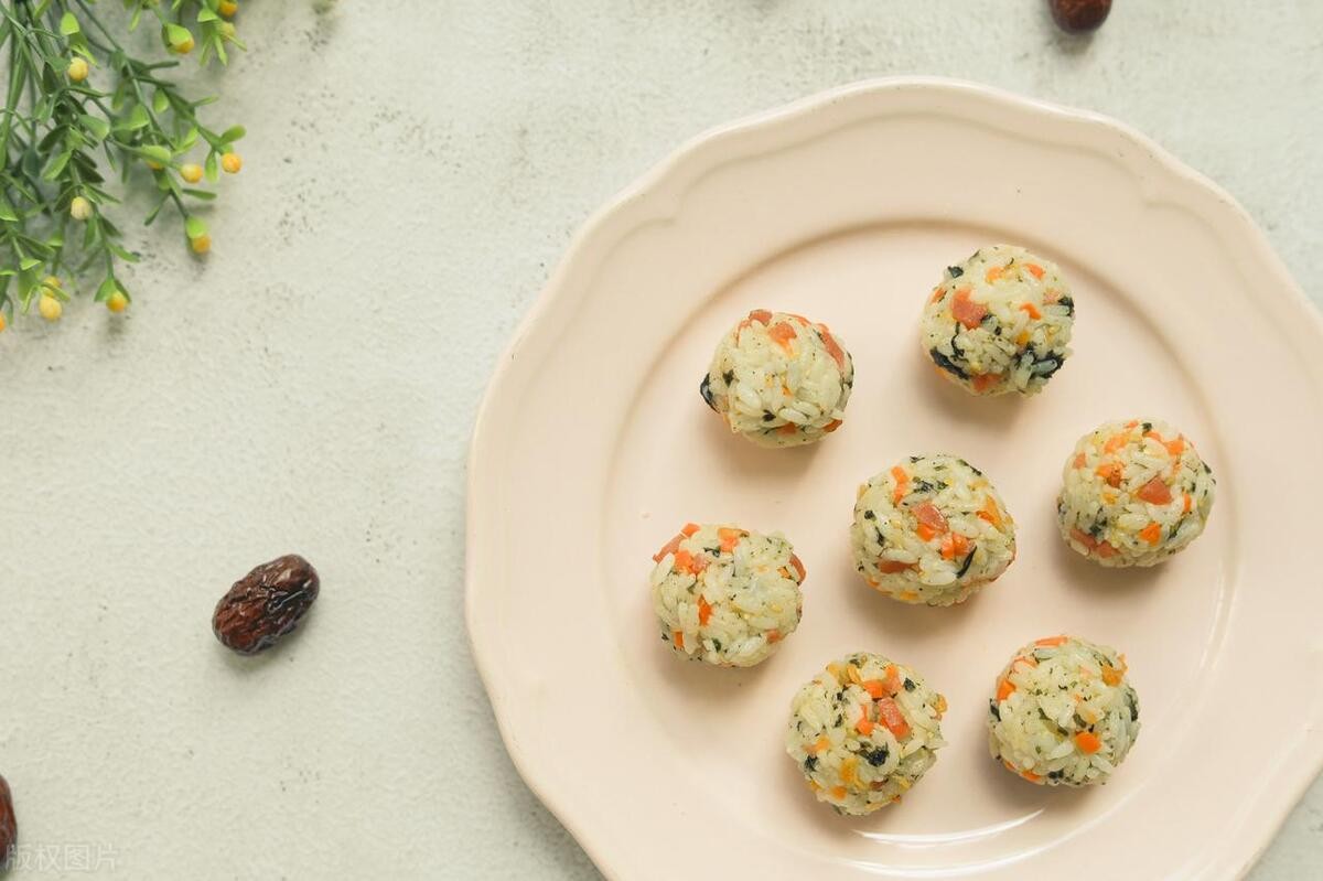 做法:将米饭搓成饭团状。将海苔剪成小片状。将青豆、胡萝卜和玉米粒煮熟,捞出沥干水分。将小番茄切半。将海苔片包裹在饭团上,再将煮熟的青豆、胡萝卜和玉米粒以及小番茄放在饭团上。最后在饭团上挤上沙拉酱即可。