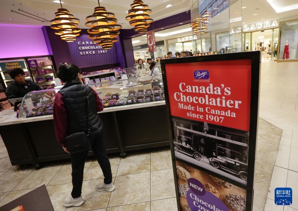 2月25日,加拿大温哥华一家巧克力店前摆放着印有“加拿大制造”的标牌。