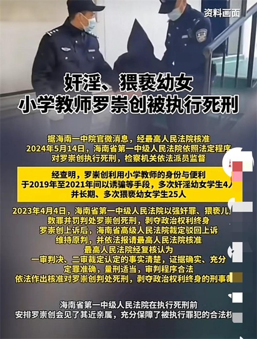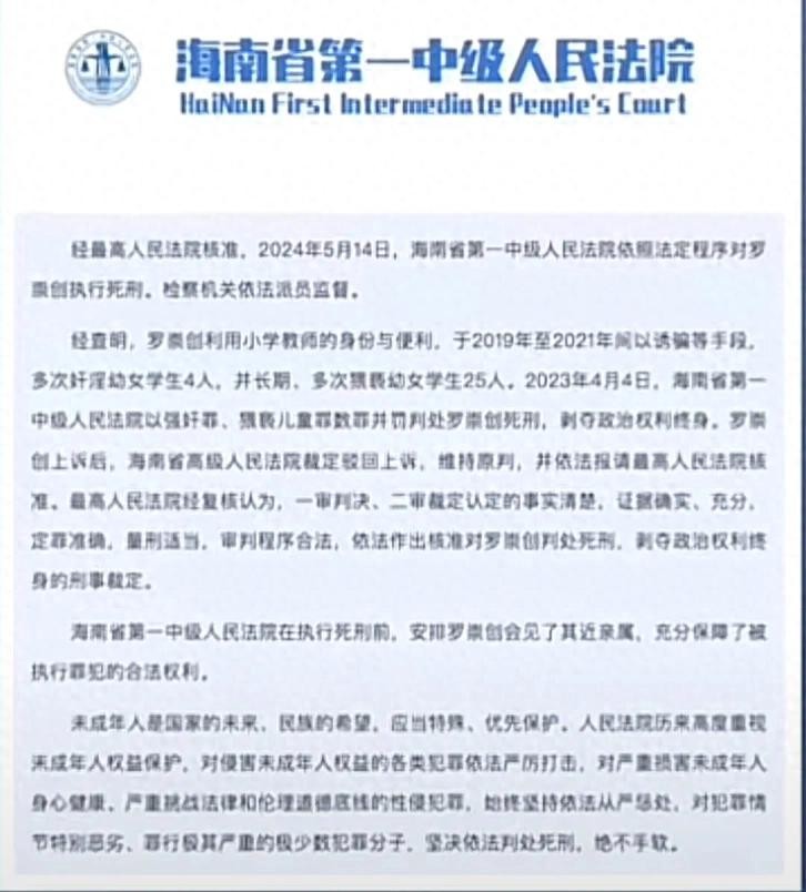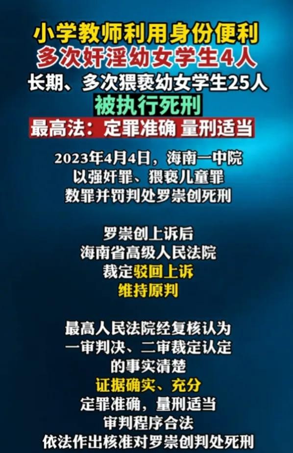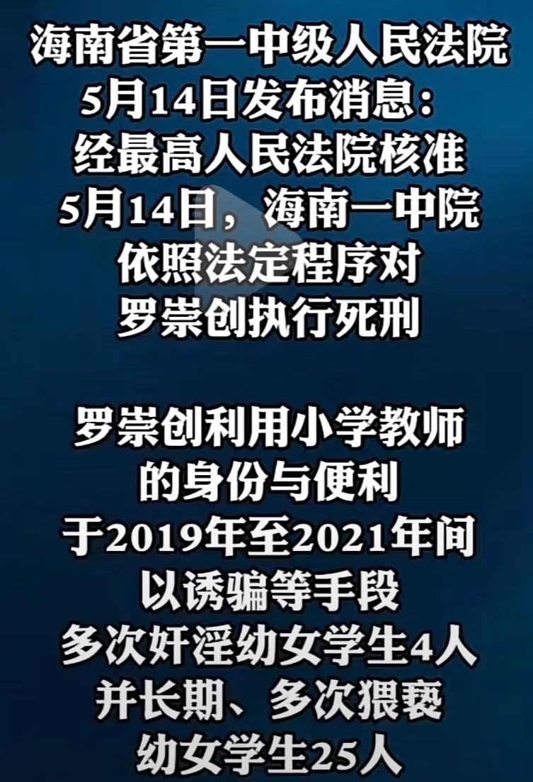 海南省第一中级人民法院 5月14日发布消息: 经最高人民法院核准 5月14日,海南一中院 依照法定程序对 罗崇创执行死刑, 罗崇创利用小学教师的身份与便利,于2019年至2021年间,以诱骗等手段 多次奸淫幼女学生4人 并长期、多次猥亵 幼女学生25人