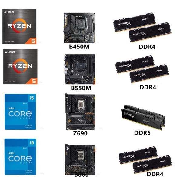 锐龙5 5600X拥有6个核心12线程,而i5-12600K拥有6个大核4个小核共16线程,所以本次测试不进行手动超频,我们的测试平台选择TUF品牌的AMD B550主板和Intel B660主板,都使用DDR4 3200Mhz的内存条,具体配置如下图所示。