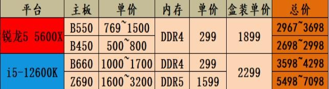 还有一点不得不提的是,AMD的5600X是可以在B550主板上轻松开启PBO全核心增强的,而Intel玩家如果使用B660给i5 12600K进行超频则是非常困难的,如果Intel用户想要获得完全的超频体验,则需要购买Z690主板,那么板U总体的价格会达到4000往上,预算不得不增加很多。