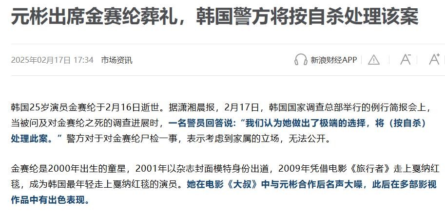 韩国警方表示,未发现金赛纶家中存在外部入侵或者其她犯罪行为的痕迹,现场也没有发现她留下来的遗书。