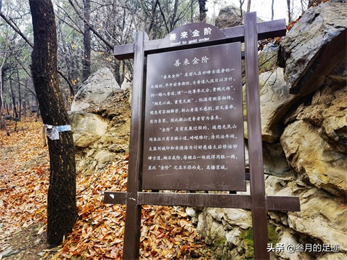继续上行可以看到一块指示牌,善来进阶,相传是清同治年间,太监刘诚印和安德海为讨慈禧太后的欢心,而修建的妙峰古道,每铺石一块就得用银一两,因此又得名“金阶”。