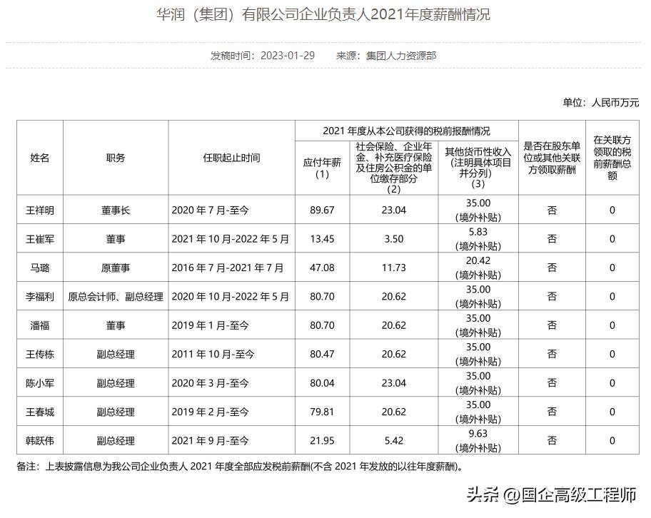可以看到,2021年华润集团领导收入最高的是董事长王祥明先生,其税前年薪约为89.67+23.04+35(境外补贴)=147.71万元。