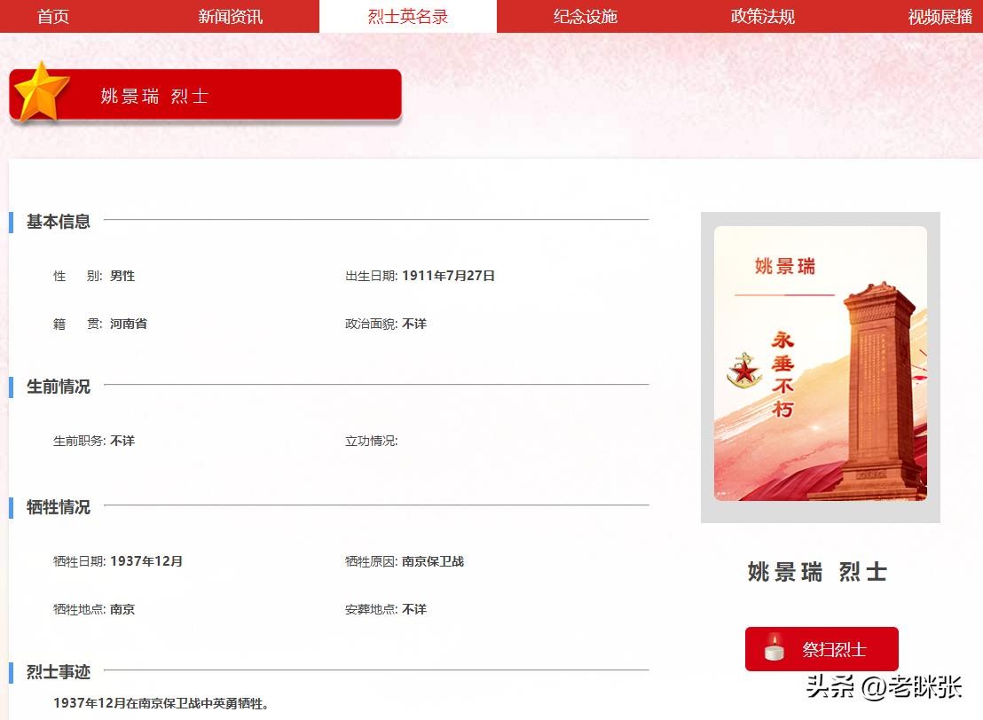清明节即将到来之际,抗日英雄姚景瑞烈士英名被“中华英烈网(官方)”收录。