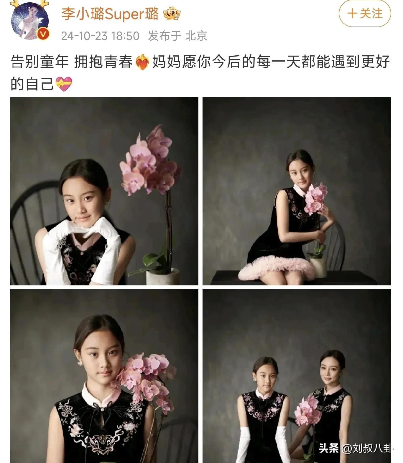 李小璐在个人社交平台发文庆祝甜馨的生日,她深情地写道:“告别童年,拥抱青春。妈妈愿你今后的每一天都能遇到更好的自己。”同时,她还晒出了四张母女二人的写真照。照片中,李小璐和甜馨都身着黑色旗袍,同框合影十分温馨。甜馨已经出落得亭亭玉立,五官精致,长相酷似爸爸贾乃亮,完全继承了父母的优秀基因。网友们纷纷在评论区留言,称赞母女二人的颜值和气质,更有网友表示:“甜馨真是越来越美了,简直就是小女神!”