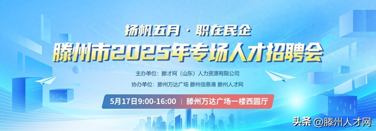 本次招聘会由滕才网(山东)人力资源有限公司主办,滕州万达广场、滕州信息港、滕州人才网协办,阵容强大,保障有力。2025 年 5 月 17 日 9:00 - 16:00,就在滕州万达广场一楼西圆厅,大规模的招聘盛宴等你来!