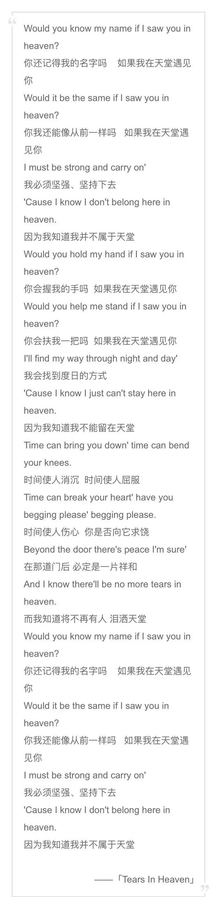 这首欧美经典歌曲《Tears In Heaven》(泪洒天堂)背后,是一个令人伤感欲绝的事情。英国音乐人、作曲人、电吉他大师Eric Patrick Clapton(埃里克·帕特里克·克莱普顿)1991年写下此曲,祭奠只有4岁半却离他而去的儿子。