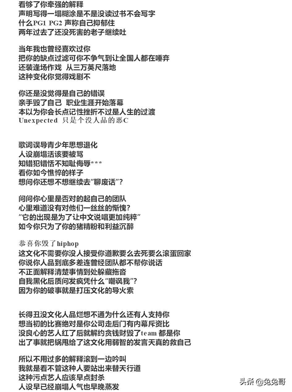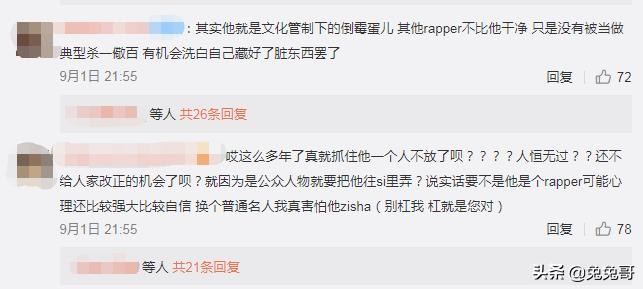 “他就是文化管制下的倒霉蛋儿,其他rapper不比他干净,只是有机会洗白自己藏好的脏东西罢了,而他是被当作典型的杀一儆百”部分网友觉得这么多年了为什么就抓着他一个人不放,人恒无过?人家就不能有改正的机会吗?换个普通人遭受这样的全网黑恐怕早就轻生了。