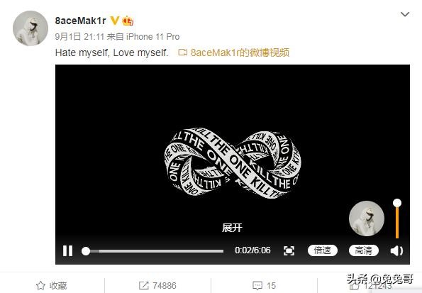 9月1日,他在社交平台发表了自己的一首新歌,歌曲名称为《Hate myself,Love myself》,歌词中既有他对过往的反思,也有代入网友们对他的恶评。其中有一句歌词是“善恶已被定夺只剩下选择迎合”,似乎是在暗示自己被迫道歉。