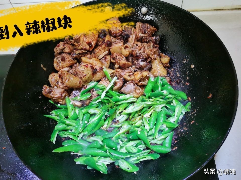 3、倒入辣椒块,将鸡肉覆盖在辣椒块上,焖15秒。