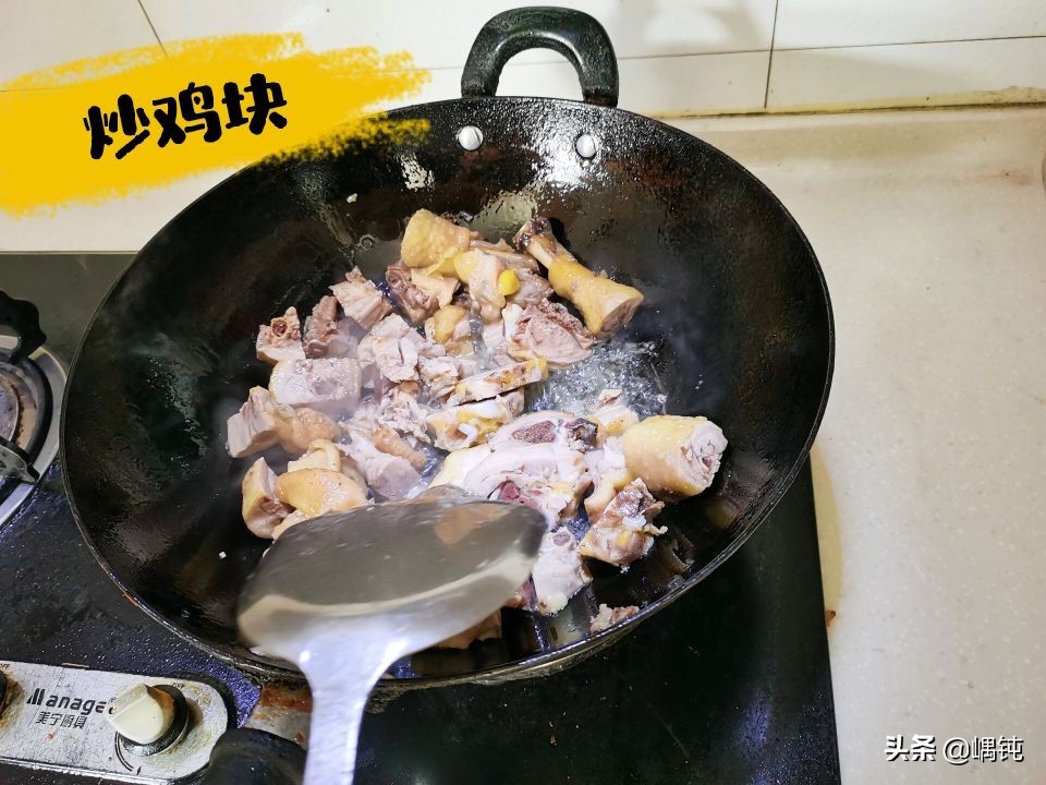 1、起锅烧油,油温微热,倒入鸡块翻炒。