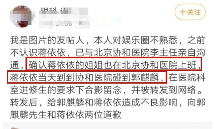 不过,紧接着就有粉丝扒出晒图者的回应,原来是因为蒋依依的姐姐在该医院上班,蒋依依是碰巧遇到郭麒麟的,并且二人在科室进修生的要求下,才合影留念。