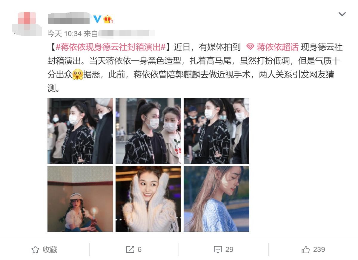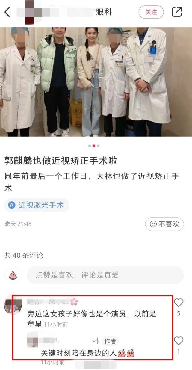 随后,又有网友扒出了蒋依依陪同郭麒麟一同现身医院,做近视矫正手术的照片。