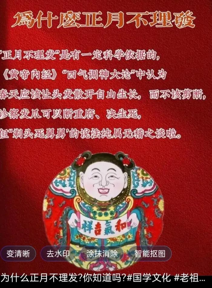 总之,正月不能理发的习俗是中国传统文化的一部分,它反映了古人对家庭、健康和自然的尊重。虽然现代社会中这一禁忌已经逐渐淡化,但了解其背后的文化内涵,对于我们传承和弘扬传统文化仍具有重要意义。!