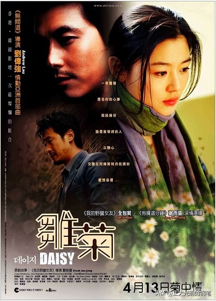 《雏菊》是一部2006年上映的韩国黑帮电影,由刘伟强执导,郭在容、庄文强、陈嘉上编剧,郑宇成、全智贤、李成宰主演。影片讲述了在荷兰阿姆斯特丹,一位女画家惠瑛(全智贤饰)与两个男人——国际刑警正佑(李成宰饰)和杀手朴义(郑宇成饰)之间的三角恋情,混杂了警匪枪战的惊险和男女感情的纠结。该片以雏菊作为爱情象征,展现了默默守护与牺牲的主题,剧情跌宕起伏,画面唯美,具有浓烈的悲剧色彩,豆瓣评分高达8.1分,是全智贤的代表作之一。
