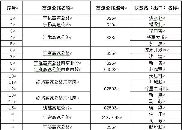通告说,为坚决遏制新型冠状病毒感染的肺炎疫情扩散,根据省市相关工作部署,自2020年1月30日零时起,对该市范围内15个高速公路收费站出口及G36宁洛高速新华路出口、宁合高速侯庄、瓦殿出口实行交通管控,其他高速公路出口正常通行。期间,南京市将根据省新型冠状病毒感染的肺炎疫情防控工作领导小组有关加强全省高速公路疫情防控工作要求,结合省高速公路省界查控点布设情况,动态调整收费站出口交通管控措施。
