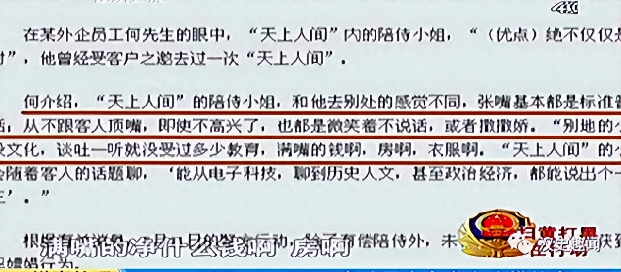 他称,“天上人间”的陪侍小姐,和他去别处的感觉不同,张嘴基本都是标准普通话;从不跟客人顶嘴,即使不高兴了,也都是微笑着不说话,或者撒撒娇。“别地的小姐没文化,谈吐一听就没受过多少教育,满嘴的钱啊,房啊,衣服啊。'天上人间'的小姐会随着客人的话题聊,'能从电子科技,聊到历史人文,甚至政治经济,都能说出个一二三'。”