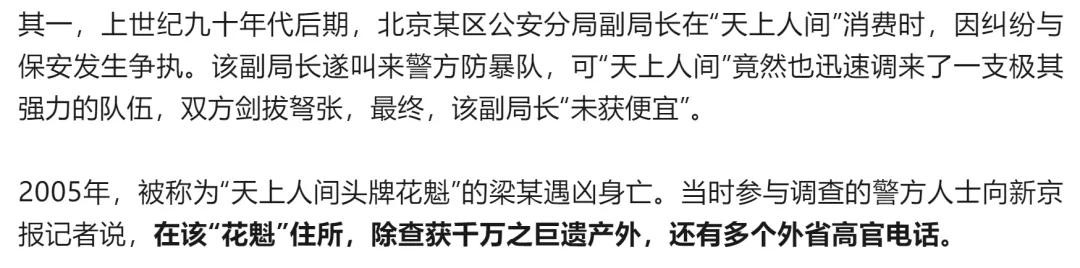 据新京报报道,警方内部人士曾向记者证实过两则传闻:一是上世纪九十年代后期,北京某区公安分局副局长在“天上人间”消费时,因纠纷与保安发生争执;二是2005年被称为“天上人间头牌花魁”的梁某遇凶身亡,当时参与调查的警方人士向记者说,在该“花魁”住所,除查获千万之巨遗产外,还有多个外省高官电话。
