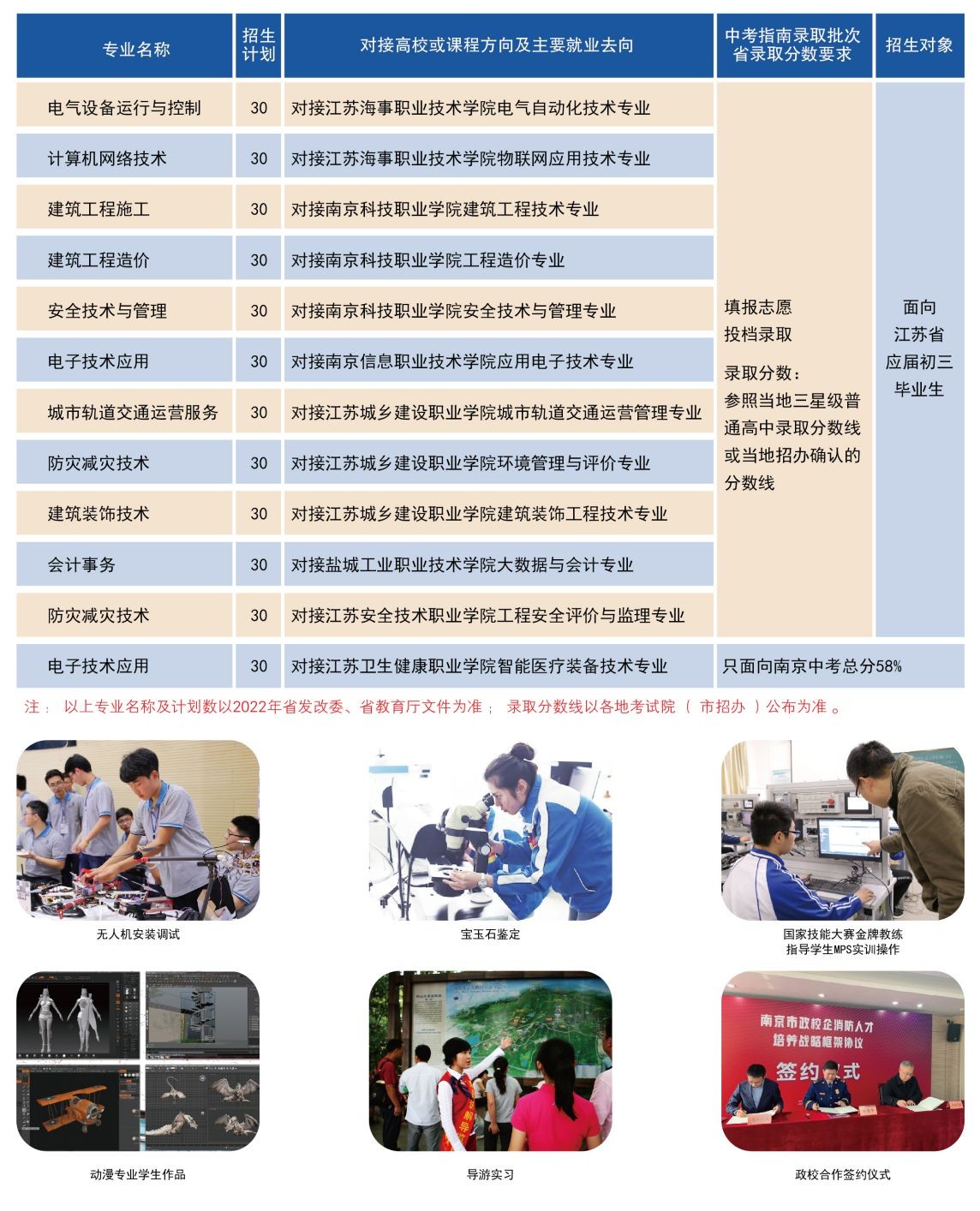 学校坚持以立德树人为根本,以服务江苏经济发展为宗旨,主动适应产业升级和新兴产业发展,形成了资源环境、建工、电子、信息、商务管理等五大专业群。现有高职专业17个,3+3现代职教体系建设试点项目12个。建成国家示范校重点建设专业4个,国家级建筑类紧缺型人才培养基地1个、国家级岩土工程专业实训基地1个,省级现代化专业群5 个,省级品牌专业7个,省级特色专业2个,省级示范专业5个,江苏省课程改革专业试验点2个。省级高水平示范性实训基地4个,省职业教育现代化实训基地3个。建成省现代学徒制试点专业、南京市现代职教示范专业、南京市专业学院、南京市产教融合实训平台等7个。