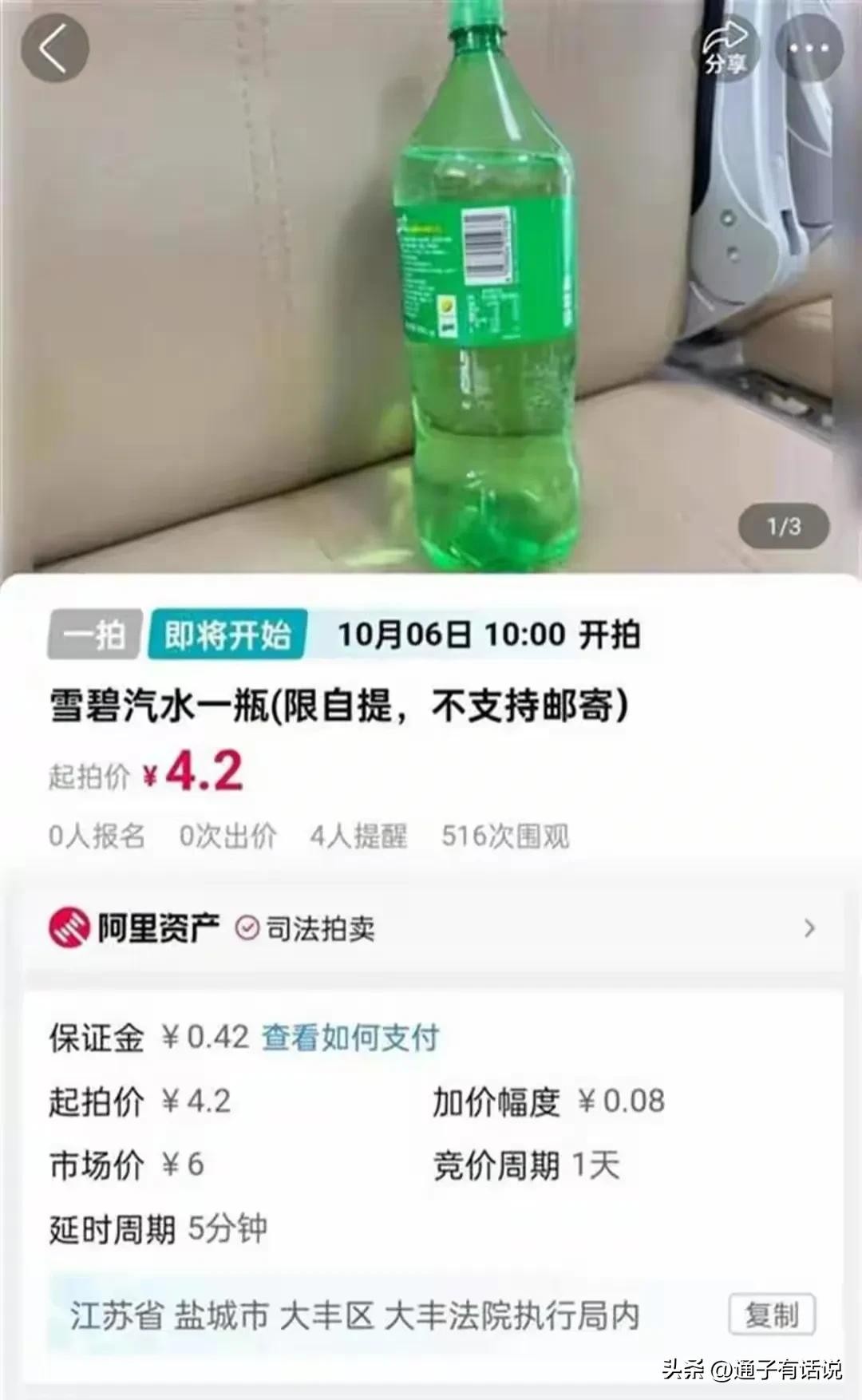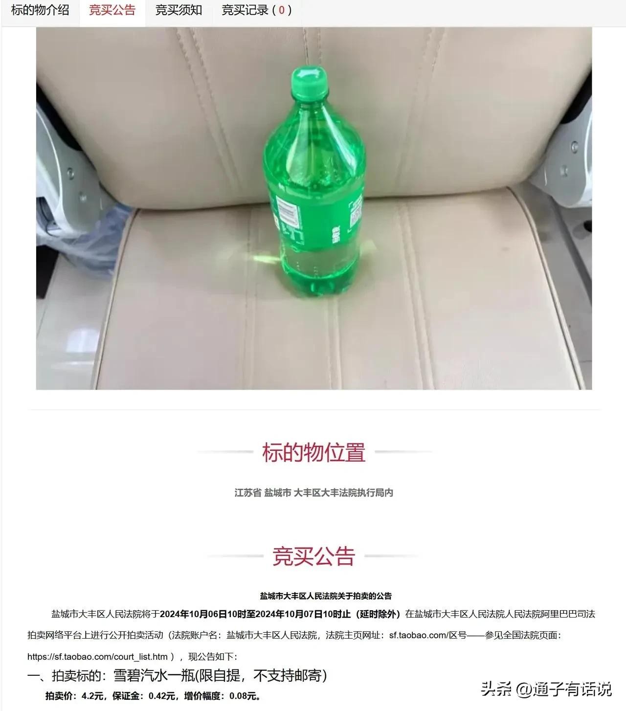 近日,江苏盐城市大丰区人民法院在拍卖平台上预告了一场拍卖,拍卖的物品是一瓶雪碧汽水,起拍价4.2元,市场价6元,拍卖信息备注只能自提,不支持邮寄。