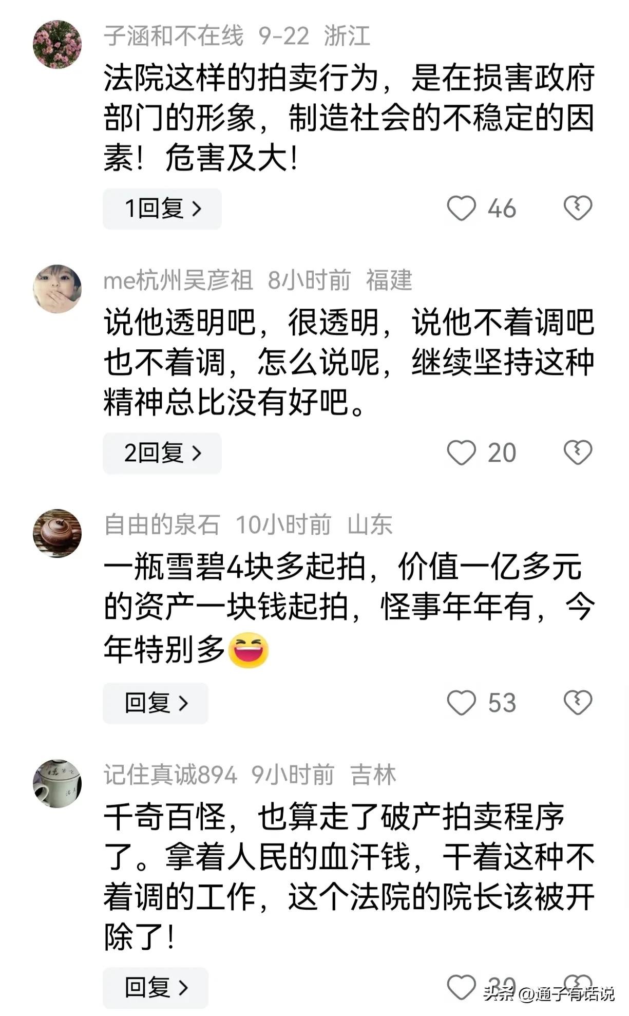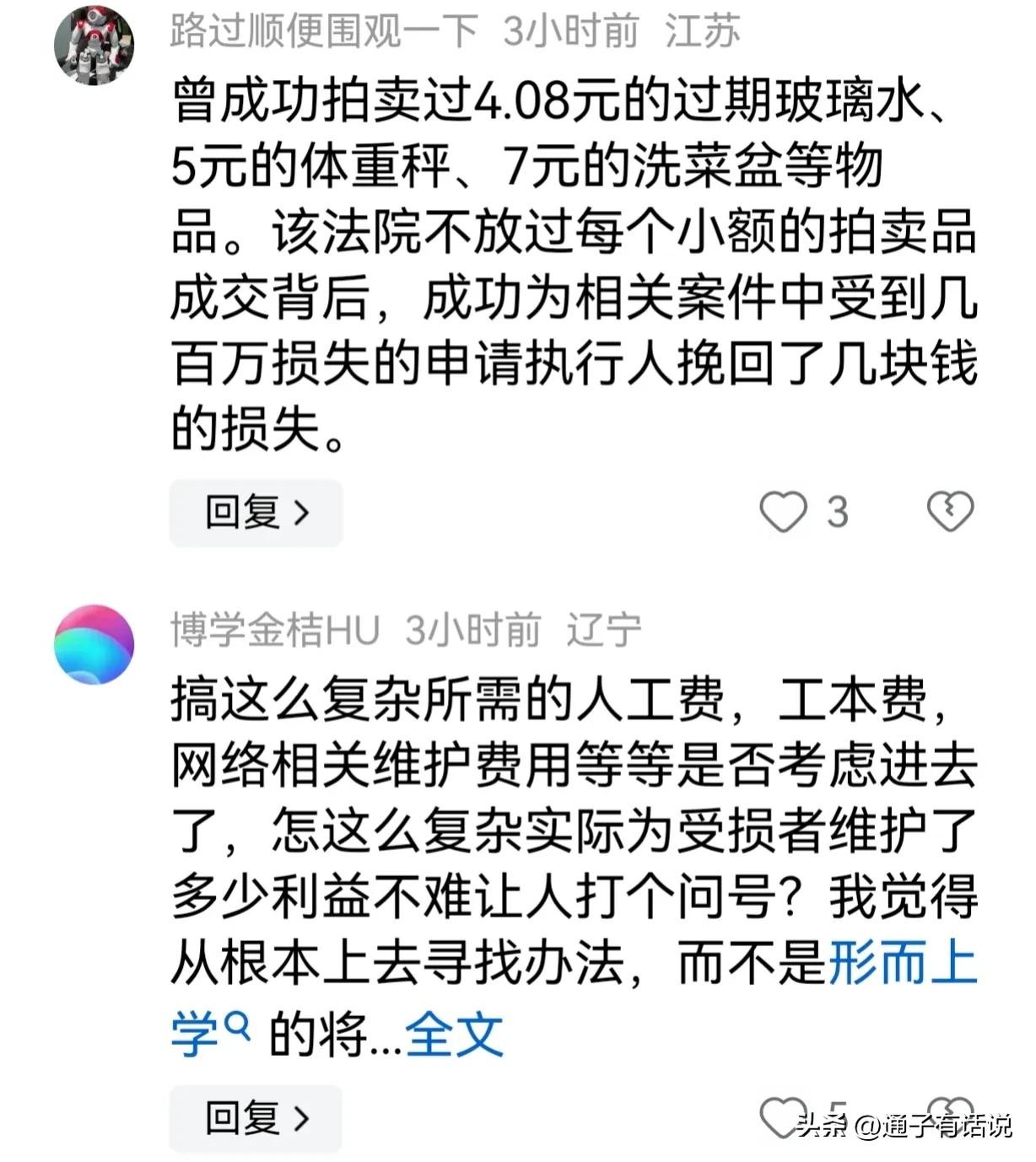 还有网友劝导:曾经拍卖过4.08元的过期玻璃水,5斤的体重秤,7元的洗菜盆等。这法院不放过每个小额的拍卖品,成交的背后……