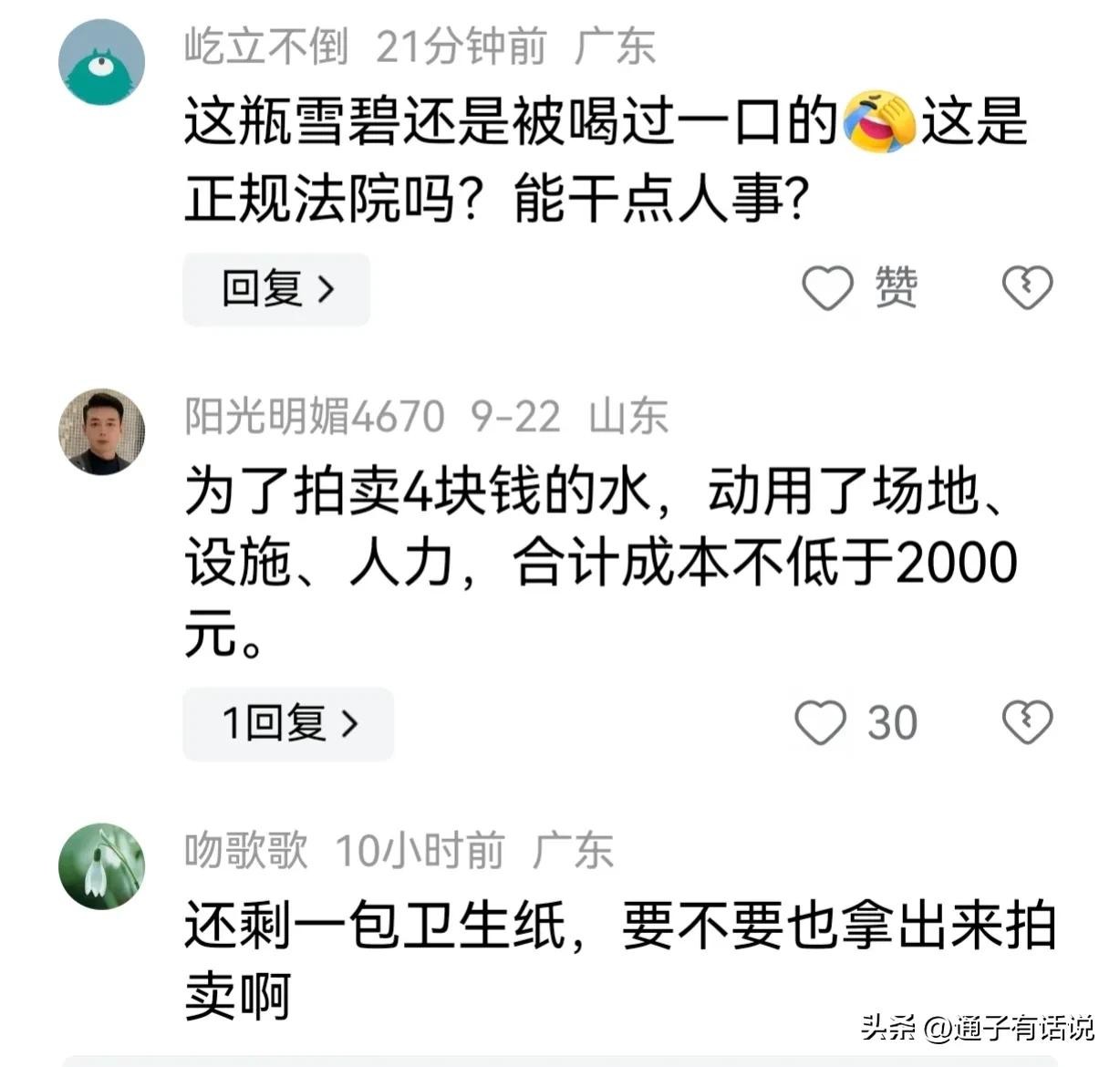 对此,有网友提出了很多质疑:雪碧还是被喝过一口的,这是正规法院吗?能干点人事吗?