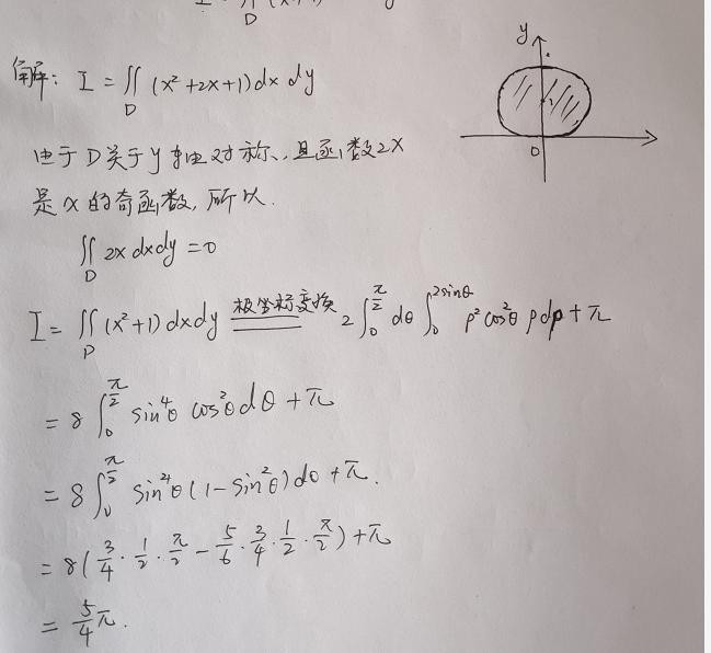 解题思路:积分区域D关于y轴左右对称,被积函数(x+1)^2=x^2+2x+1,其中2x是x的奇函数,x^2+1是x的偶函数,先利用奇,偶性化简,然后再用极坐标计算。