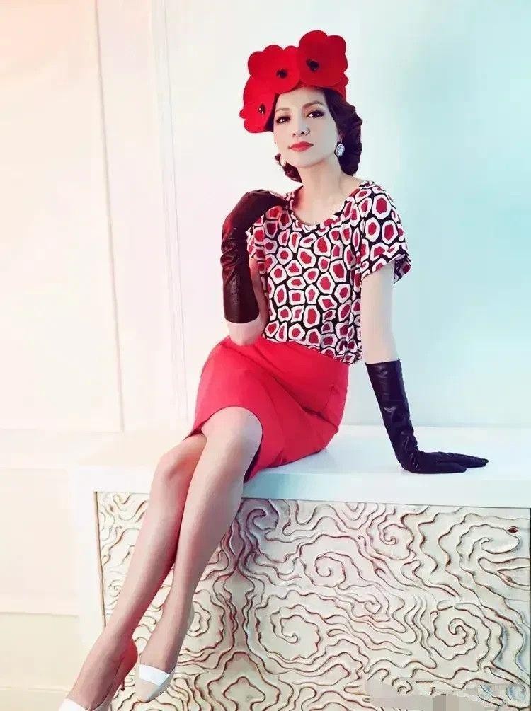 这个时候应该是在拍写真,她上半身穿了这件衣服有一点像是老人家穿的那种花衣服,下面搭配了一条红色的裙子,这条裙子还是包臀的设计,感觉显得还是挺性感的,并且这个时候头上还有红色的装饰品