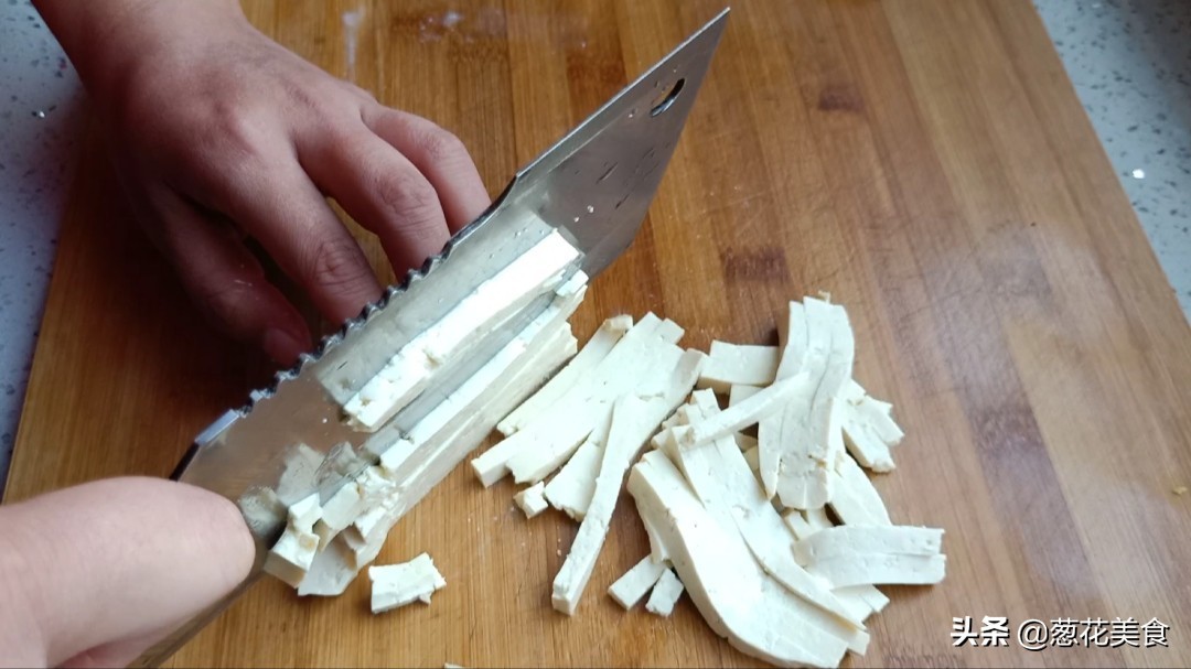 先把豆腐切成薄片,切好之后再切成细条,这里用的豆腐最好是嫩豆腐。