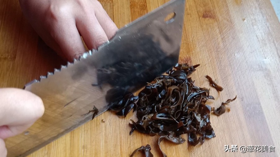 2.泡发的木耳洗干净之后也切成细条。