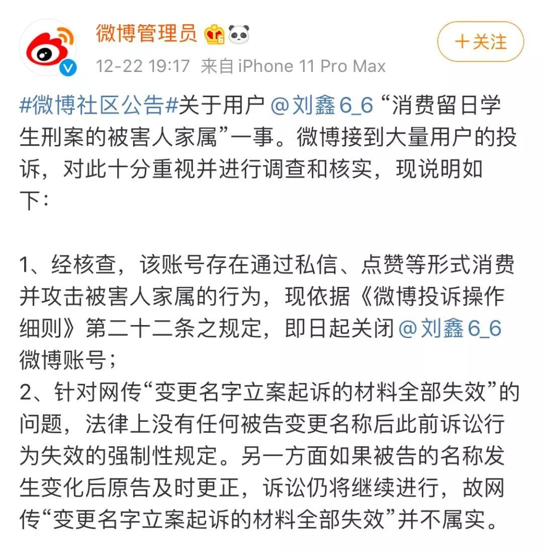 新浪微博官方微博@微博管理员 12月22日发布消息称,关于用户@刘鑫6_6“消费留日学生刑案的被害人家属”一事,微博接到大量用户的投诉,对此十分重视并进行调查和核实,现说明如下: