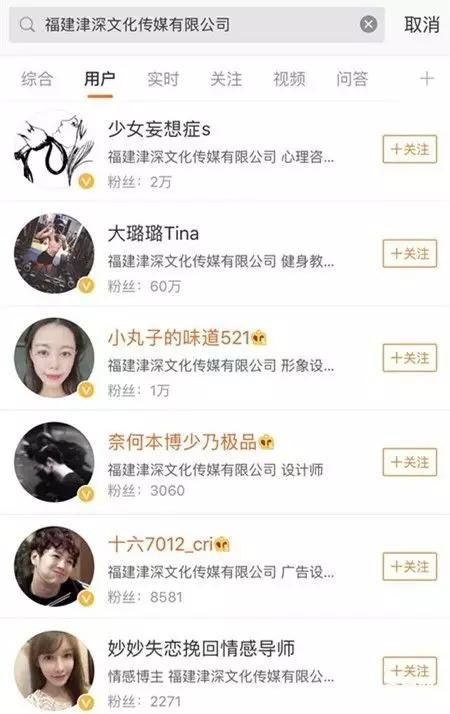 @冷眼萌叔的微博认证为“福建津深文化传媒有限公司”,通在企业查询网站,记者查询到了这家注册地址位于福建福州的文化传媒公司。公司在网站上提供的信息很少,主要成员只有两位,大部分信息数据都为0,记者拨打了注册留下的电话,提示对方已关机。随后,记者在微博搜索这家公司,意外发现,有十几个微博的id认证为该公司的董事、设计师、健身教练、心理咨询师等等,粉丝数量都不少。