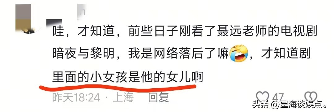 网友才知道女儿跟着父亲演了不少剧:哇,才知道,前些日子刚看了聂远老师的电视剧才知道剧暗夜与黎明,我是网络落后了嘛合里面的小女孩是他的女儿啊。