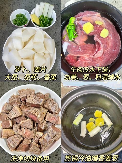1.准备萝卜、姜片、大葱、葱花、香菜,牛肉冷水下锅,加姜、葱、料酒焯水,洗净切块备用
