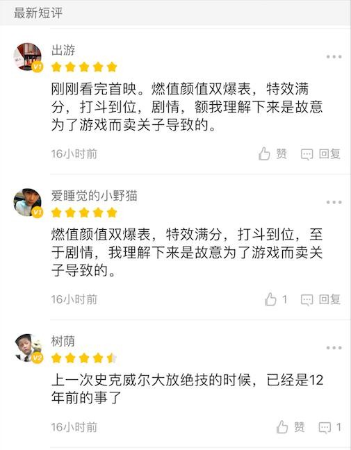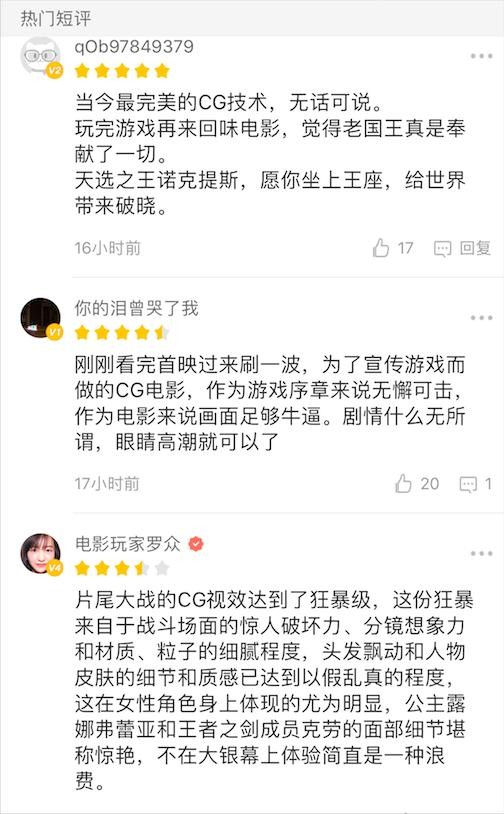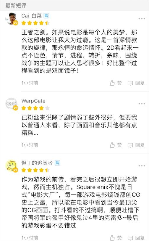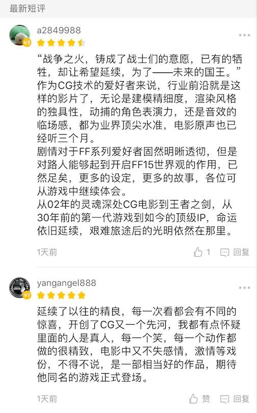 目前《最终幻想15:王者之剑》已收到超800多条好评,打好评的观众认为此片CG特效强大、战斗场景宏大,在大银幕上体验这种视效场景非常养眼。而差评则认为电影特效满分剧情却薄弱,对没玩过游戏的观众来说很难理解剧情。