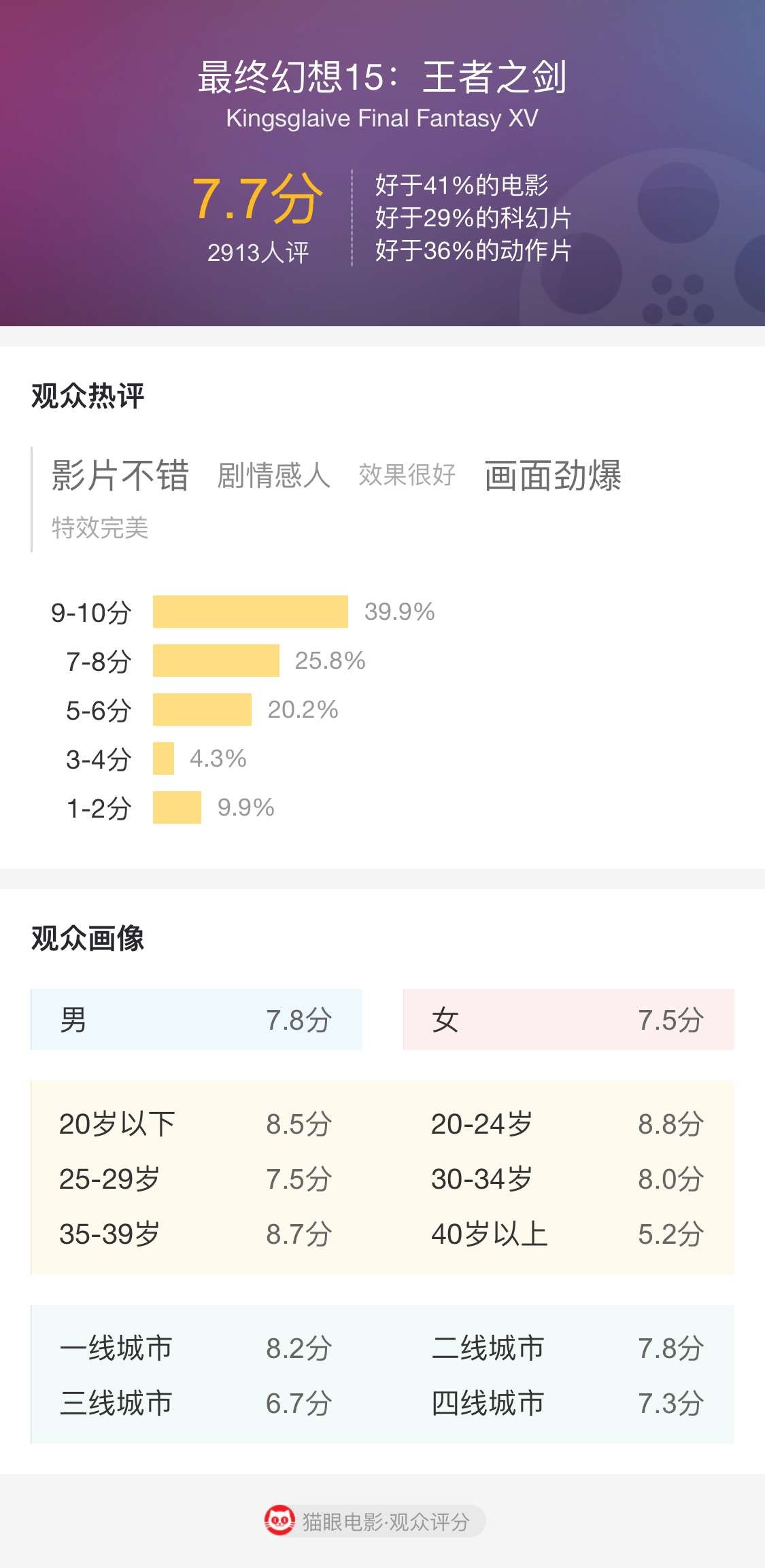 目前,有超39.9%的观众给《最终幻想15:王者之剑》打9-10分,打7-8分的有25.8%,好评为65.7%,从打分来看,对于这部影片观众争议较大,6分之下有34.3%。而20岁以下的观众打分8.6分,20-24岁的观众打分8.8分,可见一线城市的年轻的观众们更喜欢这部特效大片。