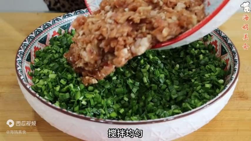 ·醒面的时间里来制作馅料,自己喜欢的菜这里可以随意。我准备的是一把韭菜切碎,切好的韭菜放入盆中,少放一点小苏打保持韭菜的翠绿,再加上一些油能够锁住韭菜里的水分,混合均匀。