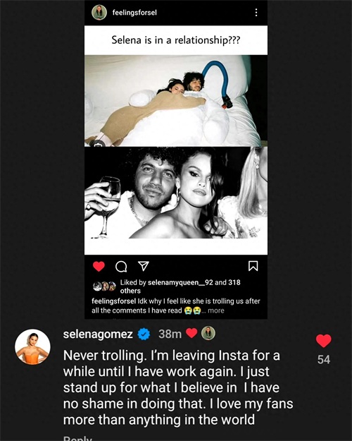 不少人开始质疑她的决定,认为她是被负面评论和争议击败了。但赛琳娜并没有回避这些批评,她直截了当地回应粉丝们:“我没溜粉,我要退出 ig一段时间了,直到我再次开始工作。我只是坚持我相信的东西。我不觉得这么做有什么不好意思的。我爱我的粉丝胜过世界上的一切。”