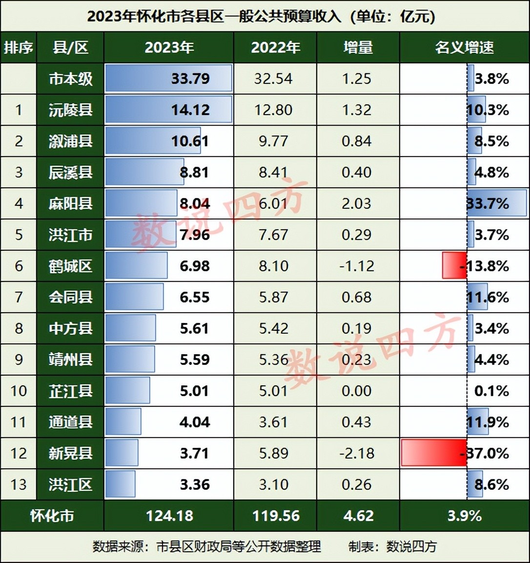 怀化各县2023年财政收入:2县负增长,麻阳县接近辰溪县