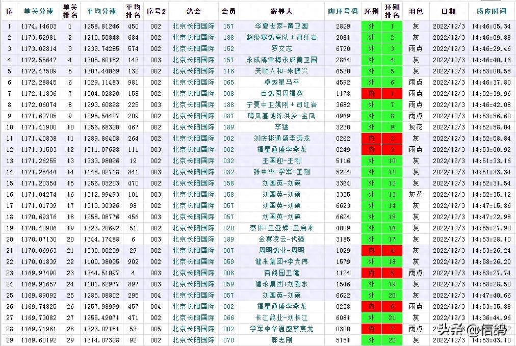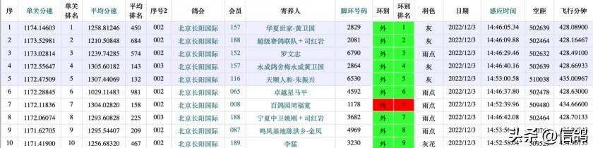 此时的华北地区,气温早已下降到令下,勇敢的赛鸽不畏低温的困扰,顶着寒风飞快向着目标地飞来。下午两点多,首批赛鸽陆续到达,来自院外团队-华夏世家-黄卫国名下的一羽2829号赛鸽突破重重考验,拿下本关第一名,分速为1174米/分。